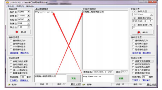 以上內容操作確認無誤后,就可以進行串口服務器與以太網的數據傳輸調試了