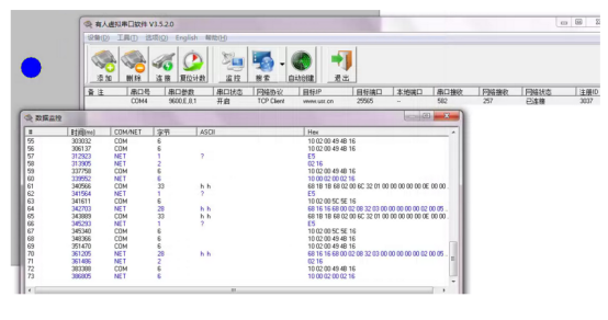 第四,數據監控。虛擬串口軟件點擊監控。COM為組態軟件發送的數據,NET為PLC通過GPRS網絡發給電腦端口的數據。能發送能接收,說明數據傳輸正常。