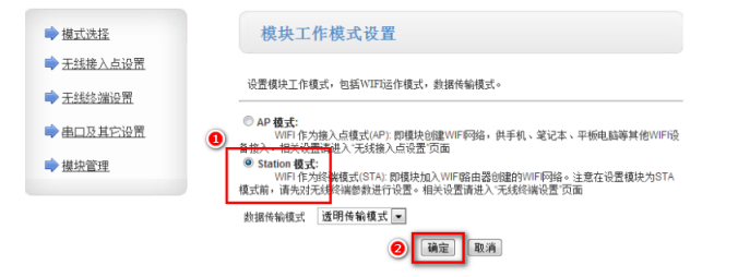 1..電腦與模塊的無線信號連接后,打開瀏覽器輸入10.10.100.254,賬戶密碼均為admin,進入內置網頁設置界面。設置模塊為STA模式,點擊“確定”按鈕。