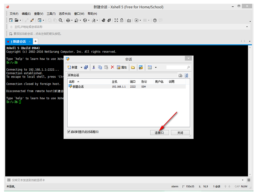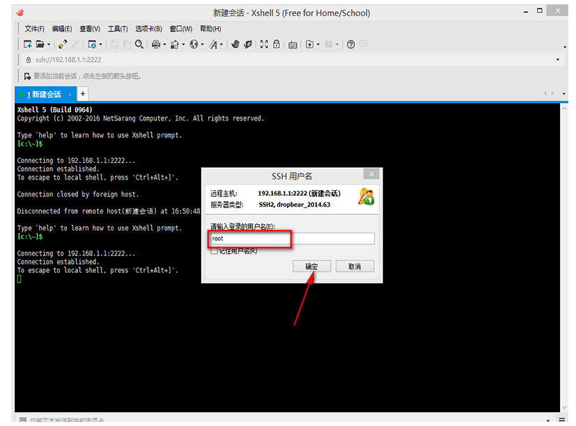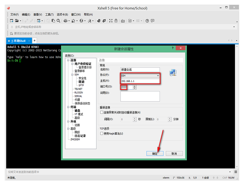 步驟三,打開軟件,點擊“新建”,協議選為ssh主機填寫192.168.1.1 ,端口號填寫2222,點擊“確定”按鈕,進行下一步。