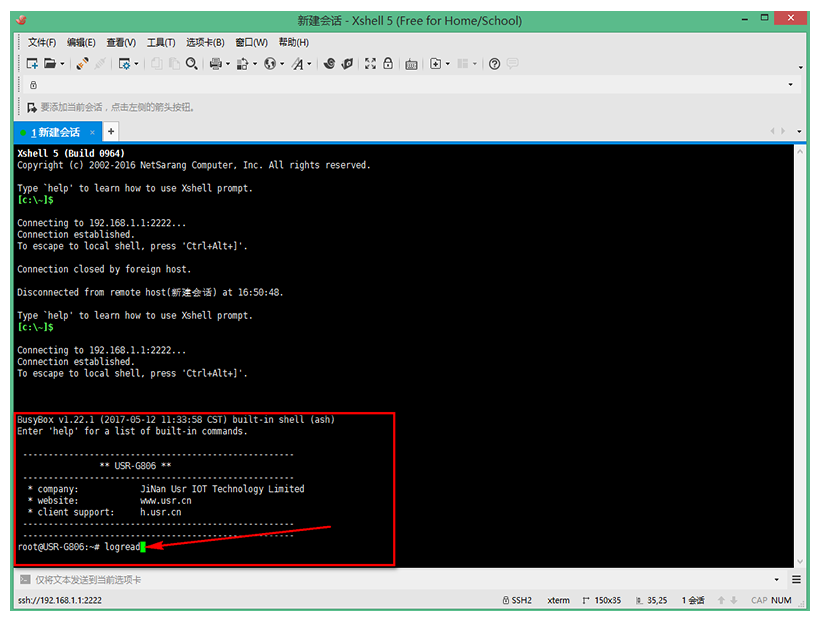 以有人的4G工業路由器USR-G806為例,它是通過Xshell5軟件讀取路由器LOG日志的。