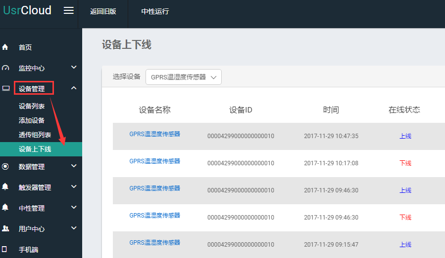打開有人透傳云http://cloud.usr.cn/,選擇“體驗賬號”進入(若有透傳云賬號的用戶可直接登錄自己的透傳云賬號)。可查看以下新增功能。也可以點擊透傳云版本更新地址http://cloud.usr.cn/update_log.html,查看透傳云版本更新詳情。