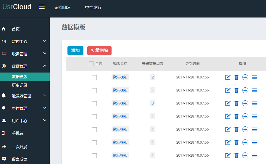 把數據點放到模板里,添加設備的時候只要關聯模板就行了,不用再編輯每個數據點了。(由于之前的版本有幾百個數據點,每次添加設備都需要編輯一遍,用戶表示比較累,因此透傳云升級版本時做了人性化處理)。