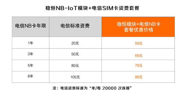 中國電信NB-IoT網絡是目前國內商用最早、覆蓋最全的運營商網絡。為了推動NB-IoT產業的快速發展與落地,有人物聯網與中國電信達成戰略合作,借助中國電信遍及全國的NB-IoT網絡,推出“穩恒NB-IoT模塊+電信SIM卡”配套銷售模式,替客戶算好經濟賬,從1年、3年、5年、8年多個維度提供前所未有的資費優惠,真正幫客戶降低實際的使用成本。