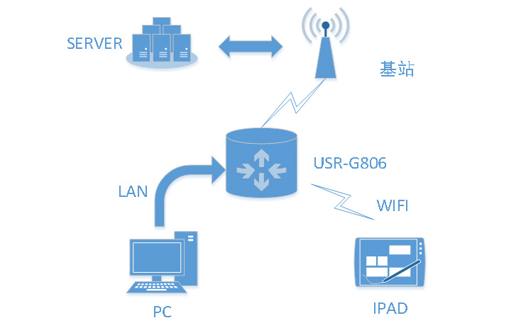 4G工業路由器以USR-G806為例,將工業路由器上電啟動后,會根據用戶預先設置好的參數,自動連接4G網絡并使LAN下的設備可訪問外部網絡。