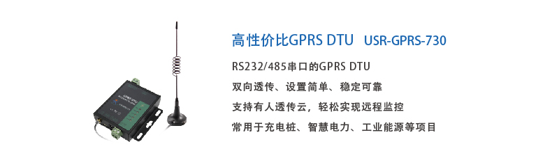 USR-GPRS-730是一款RS232/RS485 GPRS DTU,支持串口數(shù)據(jù)與GPRS網(wǎng)絡(luò)間的雙向數(shù)據(jù)透傳,設(shè)置簡單,傳輸穩(wěn)定,支持透傳云,輕松實現(xiàn)云端服務(wù)。