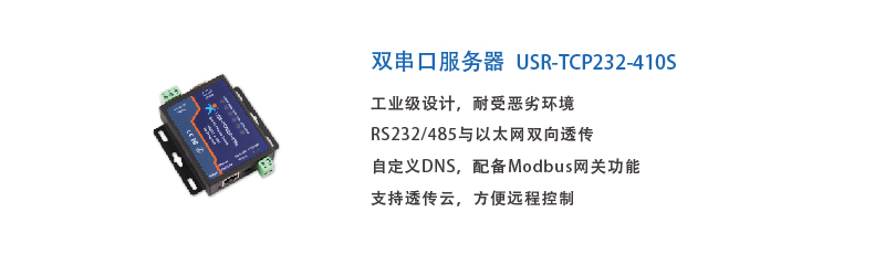 USR-TCP232-410S是一款雙串口服務(wù)器,工業(yè)級設(shè)計,耐受惡劣工作環(huán)境,用以實現(xiàn)RS232/485與以太網(wǎng)間的數(shù)據(jù)雙向透傳,支持有人透傳云,輕松實現(xiàn)云端服務(wù)。