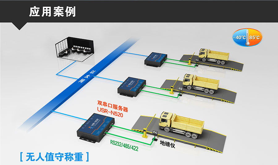 將串口服務器N520連接道閘和地磅儀,控制中心通過以太網遠程控制道閘開關和地磅儀顯示。