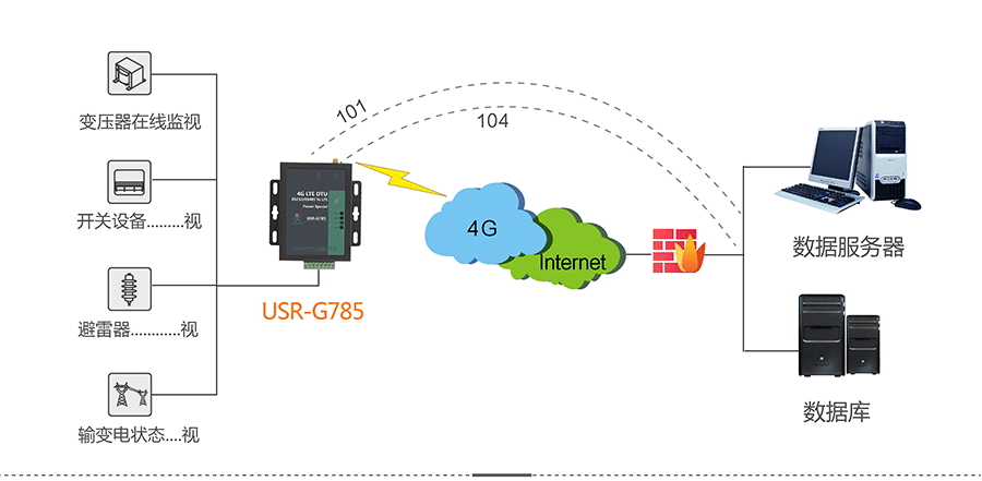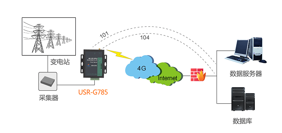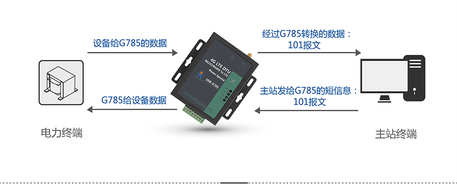 按照電力101協議傳輸數據,DTU作為子站端的一部分,只需將數據通過串口發給DTU,USR-G785就會將101報文發送給服務器。