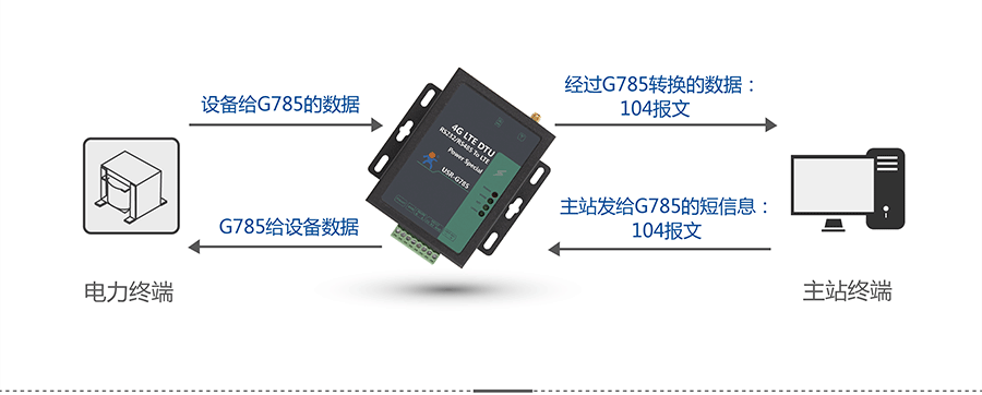 按照電力104協議傳輸數據,DTU作為子站端的一部分,只需將數據通過串口發給DTU,USR-G785就會將104報文發送給服務器。