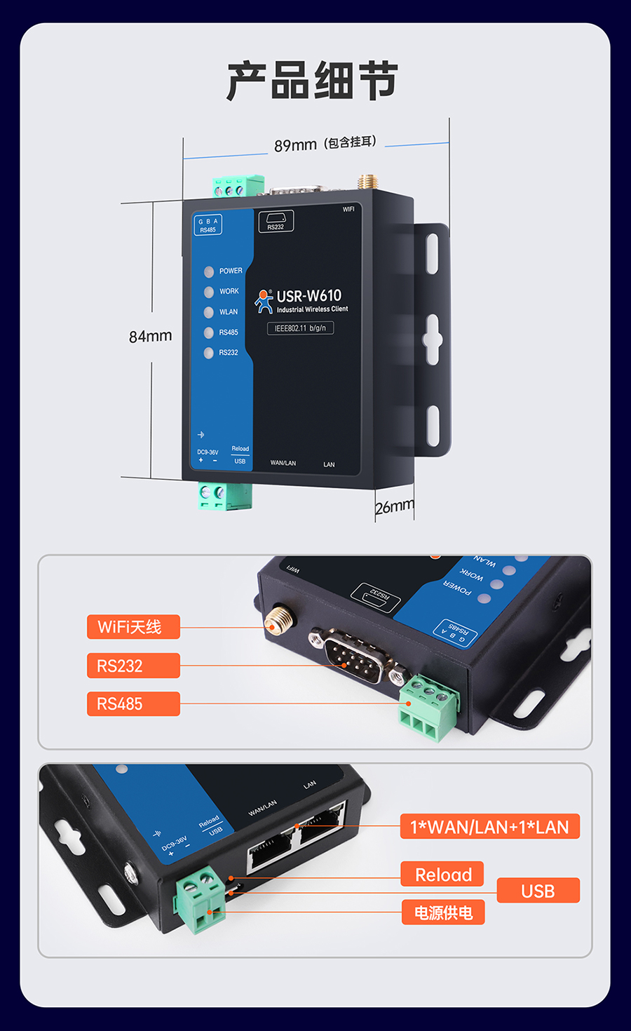 PWR、WORK、WLAN、RS485、RS232