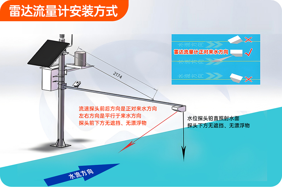 雷達流量計安裝方式 雷達流量計,為了得到較高精度,雷達一體式流量計安裝在無巨大塊石阻水,無巨大漩渦、亂流等現象的位置。