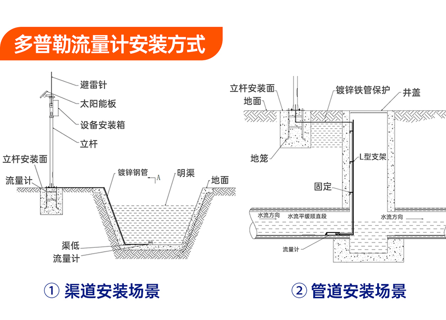 支持組播優化 超聲雷達流量計,該設備是針對管網環境設計的,不適用河道、水庫等空曠開放的場景。如有其它需求,可聯系我司銷售進行咨詢。 超聲波雷達流量計安裝方式: