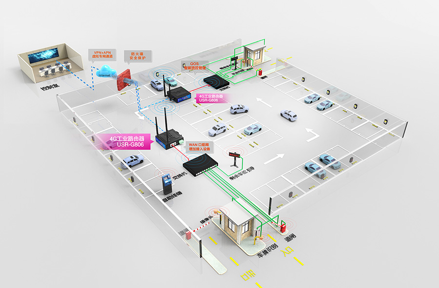 1、當(dāng)車輛離場時,終端識別和傳感設(shè)備會自動采集車輛號牌等信息,并通過4G工業(yè)無線路由器USR-G806傳輸至遠程控制中心;