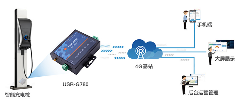 1、將4G DTU USR-G780嵌入充電樁,連接控制系統,為設備提供4G聯網功能