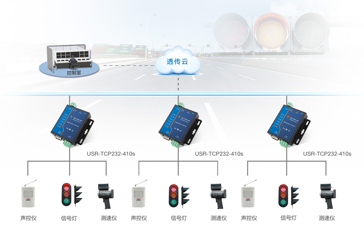 1、運營方通過工業級雙串口服務器,利用RS232和485串口與終端信號燈或控制柜相連,雙串口可同時工作,互不影響
