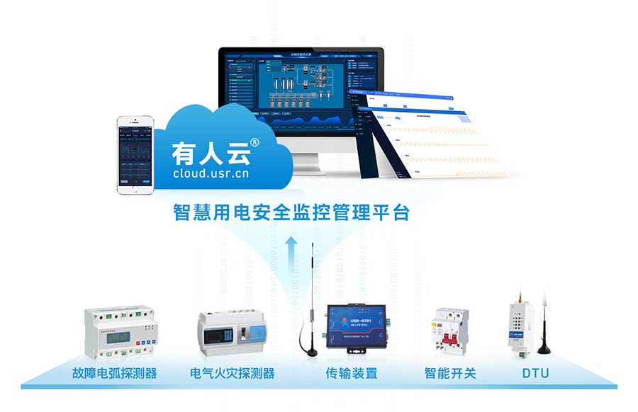 基于物聯傳感、移動互聯、云計算技術及大數據等現代信息技術,用電安全監管服務系統由智能感知終端、無線傳輸設備、用電安全監管服務平臺組成,智能感知終端將線路電氣狀態數據(線纜溫度、電流、剩余電流、故障電弧)進行實時監測,并通過無線通訊方式將數據傳送至用電安全監管服務平臺。