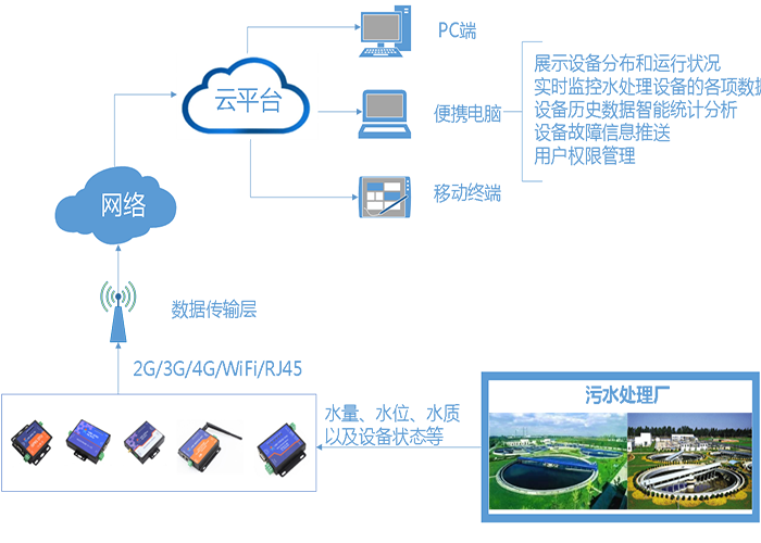 有人污水處理物聯網遠程監控解決方案將原本分散分布于各地的污水處理廠的生產運行數據進行自動采集并實時存儲、管理和處理,作業管理人員可通過客戶端對各廠、站的遠程監測及運行數據查詢。